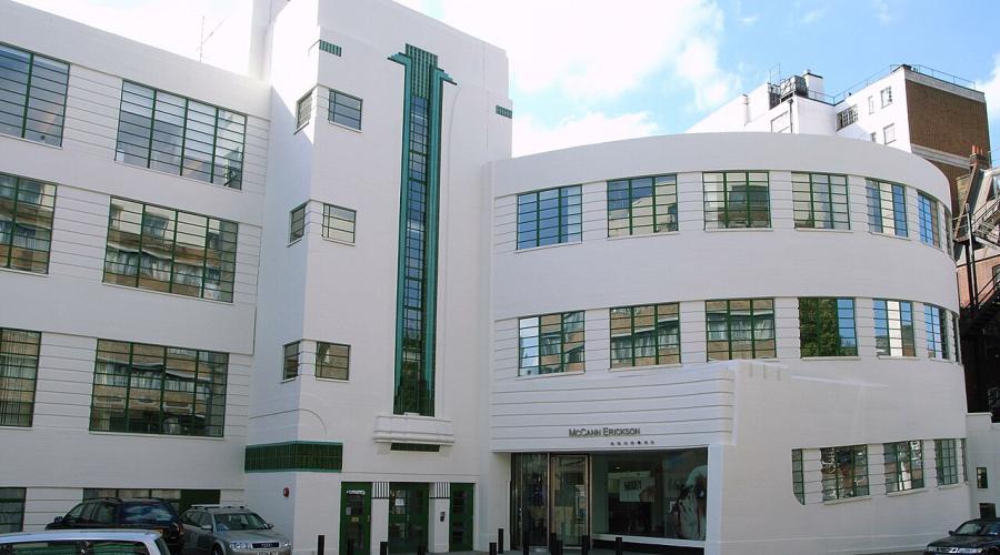 14. Daimler Garage, Herbrand Street: Former Daimler Car Hire Garage, by Wallis, Gilbert & Partners, built in 1931. Bold and suave Art Deco design with faience cladding.