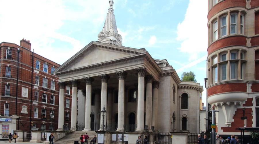 4. Church of St George, Bloomsbury: By Nicholas Hawksmoor, built 1716–31. Eccentric stepped tower or ziggurat topped with a statue of George I as a Roman emperor. Considered one of Hawksmoor’s finest Baroque works. Dramatic and wayward, elephantine at street level, and increasingly delicate as it ascends.