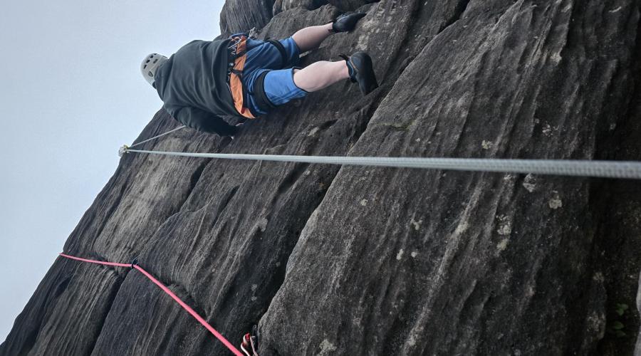 Please wear sturdy trainers as there will be a short walk across uneven moorland to the crag. These are also useful to wear when belaying a climber and for climbing too for those who do not have climbing shoes. It's also worth wearing or bringing a pair of thin liner or sports socks because if you wear climbing shoes your feet can sometimes get quite cold when climbing outdoors.