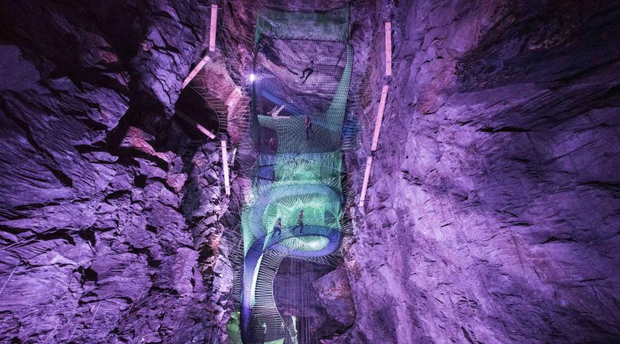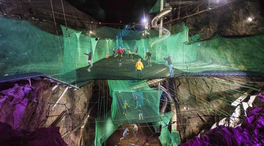 Imagine giant trampolines, walkways, slides and tunnels all made from netting. Now picture this suspended in a slate cavern hidden underground with funky lighting and you’ll have the right idea of the fun that lies ahead!