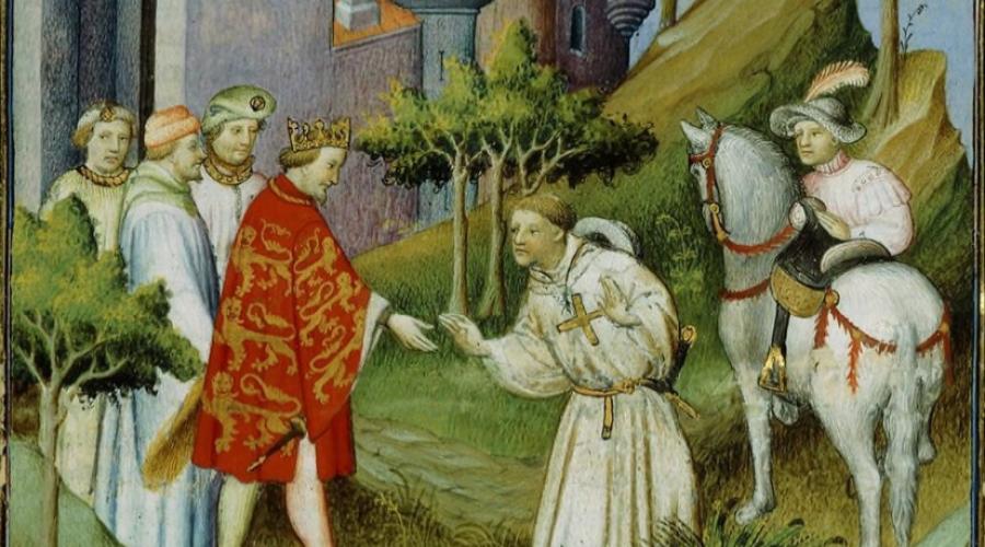 Picture 2 (teaser page): The character of Sir John Mandeville, purported English knight, is sent to travel the East by Edward II of England. Author. Mazarine Master. Copyright: Creative Commons Attribution-Share Alike 4.0 International.